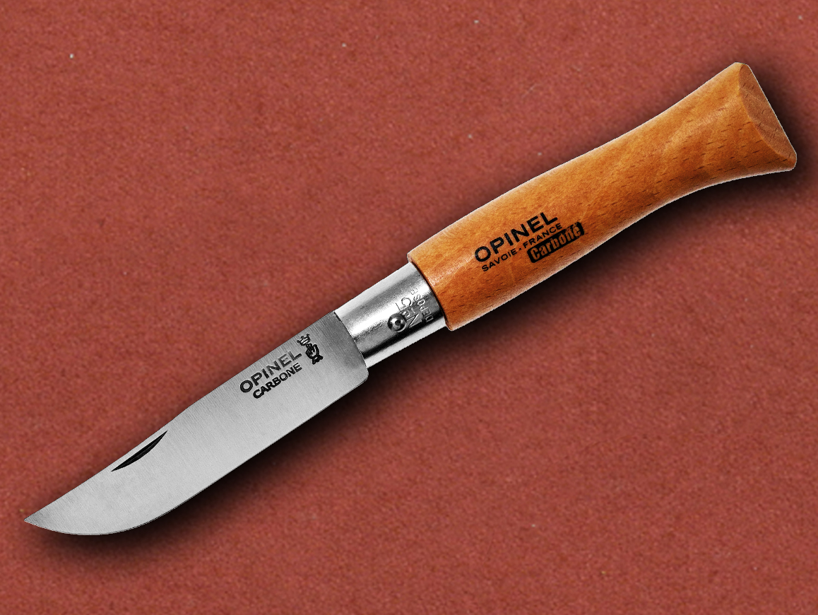 The blade of this knife is made of carbon steel. It is very easy to sharpen and hone to a thin edge, making it razor sharp, yet very strong. Carbon steel is more susceptible to rust than stainless steel and therefore needs to be cleaned properly and kept dry. If you prefer an Opinel knife with a rust-resistant blade, you can use the knives with stainless steel.