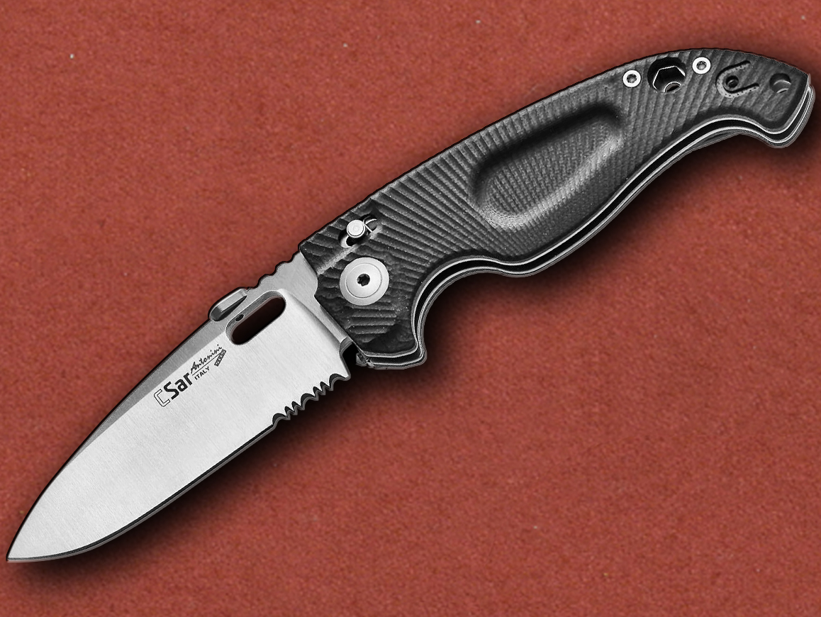 The SAR (Search And Rescue), has an orange handle and is designed for those involved in civilian rescue activities, such as firefighters and law enforcement agents, in particular in the case of people trapped inside vehicles. The blade, long and curved, ends with a belt cutter that can be used with the knife closed, and a truncated tip that acts as a screwdriver.