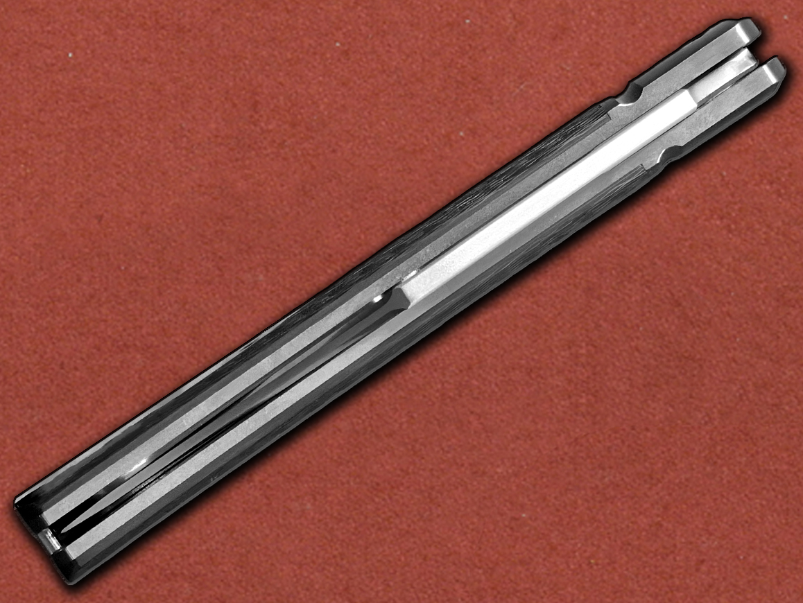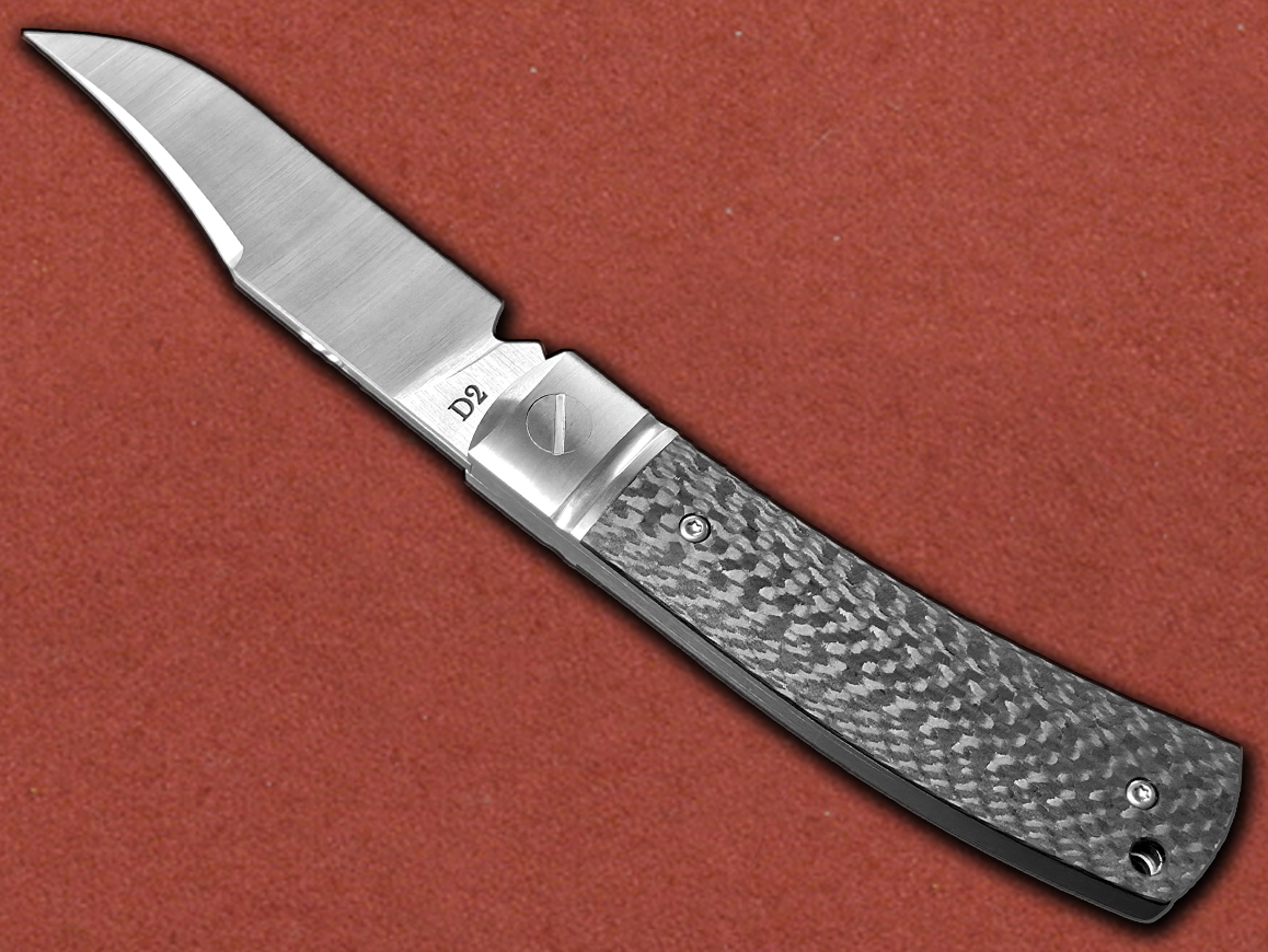 The black-and-grey carbon fibre scales aren’t just for show; they’re lightweight, grippy even in drizzle, and patterned like a stealthy herringbone suit. Held together by two stainless Torx screws (because Phillips is for amateurs), they lock into integral stainless bolsters and liners. That means the bolsters are the liners—no weak joints, no wobble, just a single forged backbone running the length of the handle. Overbuilt? Maybe. Apologetic? Never.