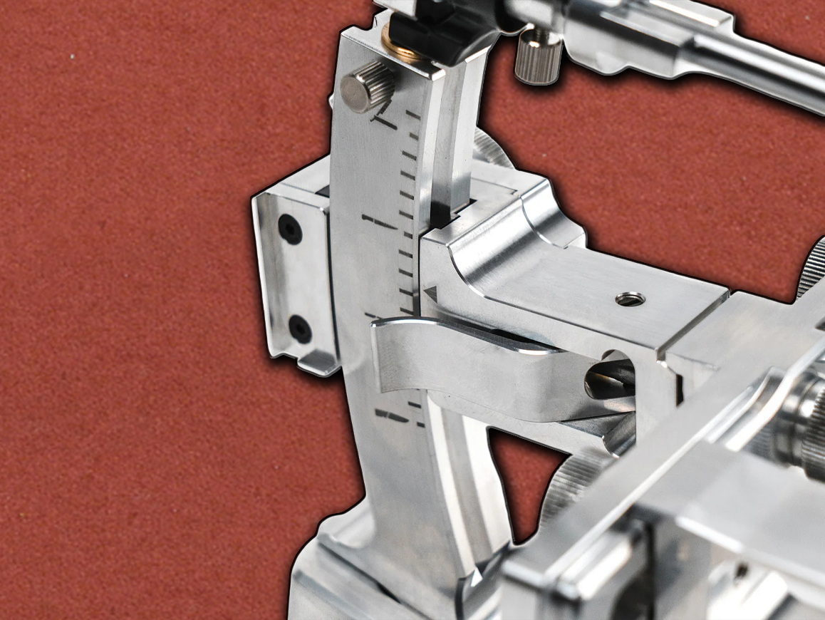 Smooth setting of the sharpening angle in the range from 9° to 28° with the toothed rack and pinion height adjuster. The height adjuster slides on the arched rack made of a single piece of aluminum. When you turn the height adjusting knob, the body moves around the virtual center where the knife's cutting edge is. After adjusting the angle, use the locking lever to fix the height adjuster.