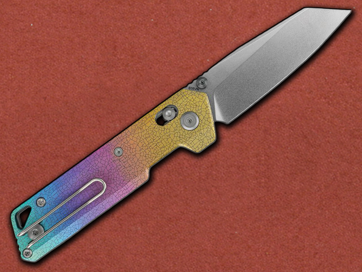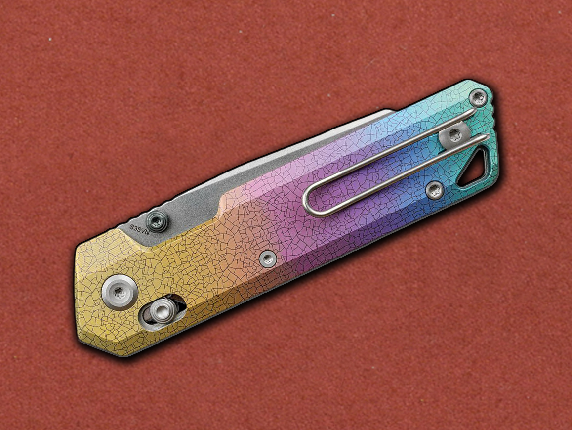 The Iridescent Crackle Titanium handle features a vivid, rainbow-like anodized finish with bold black crackle lines, echoing the cosmic fractures of parallel universes. This striking pattern is achieved through a fusion of controlled anodizing voltages and precision laser engraving, locking vibrant colors into a permanent spectrum. The result is a finish that feels alive in its intensity—bright, bold, and unmistakably unique. After extensive testing with color palettes and voltage ranges, we refined the process to achieve a surface that is both visually stunning and technically enduring.