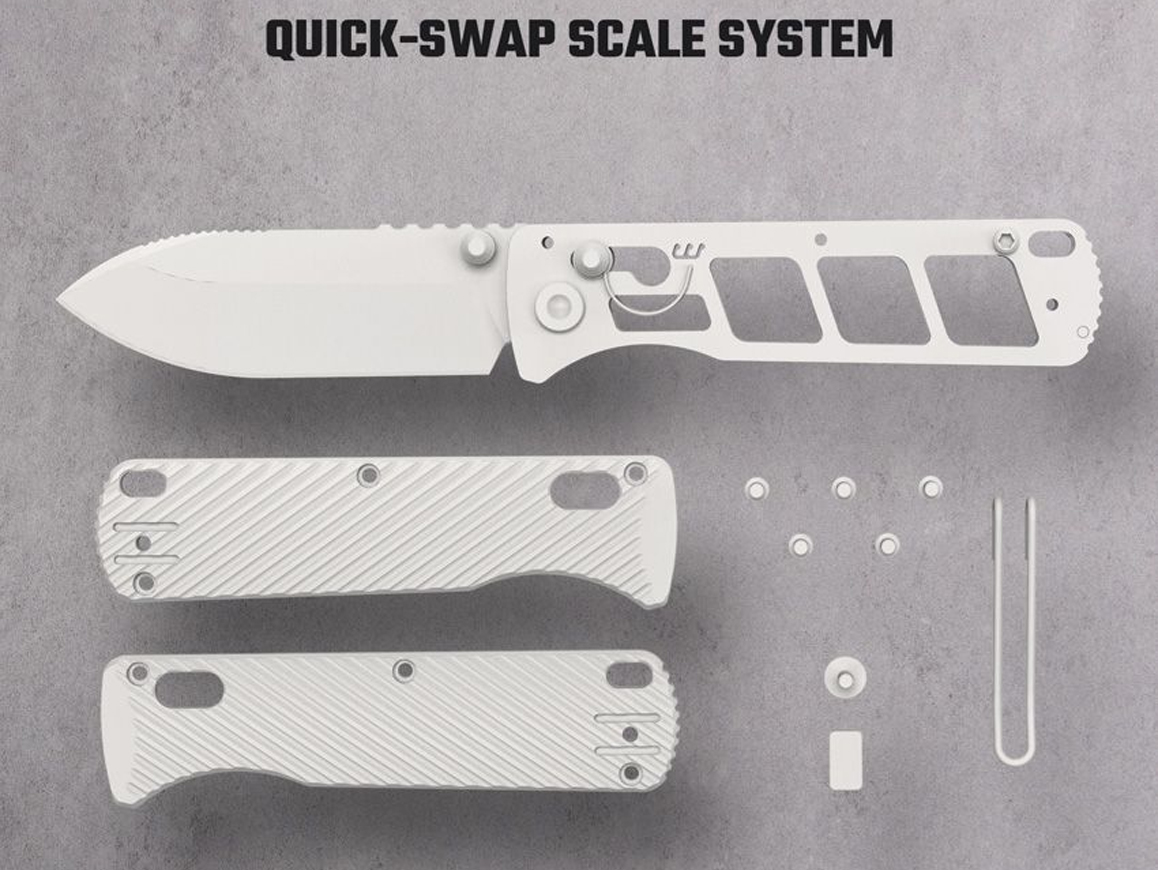 The Vombat features a crossbar lock mechanism with a quick-swap scale system. Simply unscrew the scale screws, and you're ready to swap in new scales!