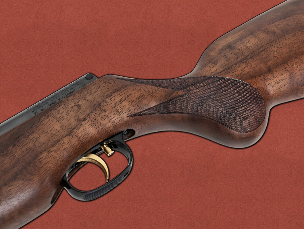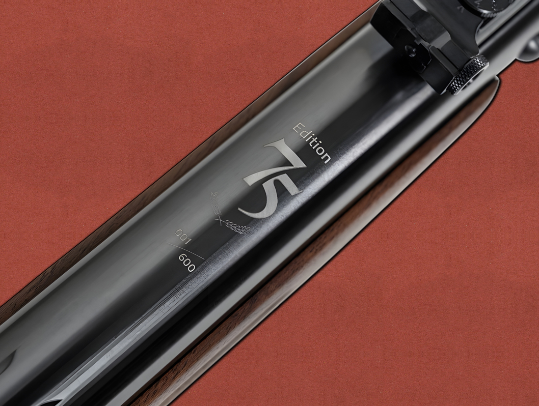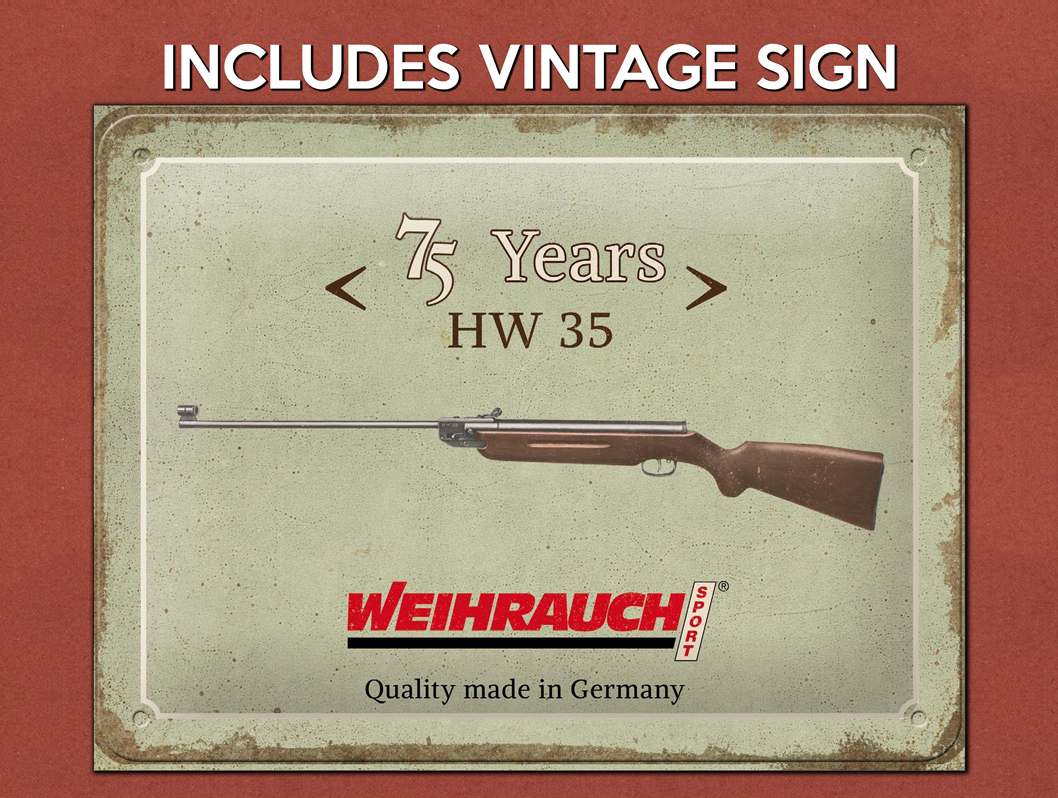 A tribute to our first HW 35 on its 75th birthday in 2026 – Anniversary model in a limited edition of 600 pieces in a retro design. Oiled walnut stock without cheekpiece, with a round, checkered pistol grip and finger groove in the forearm, mounted sling swivels with wide leather, rifle strap featuring laser engraving, action with open sights, jubilee laser engraving on the receiver, and gold-plated trigger, retro advertising sign.