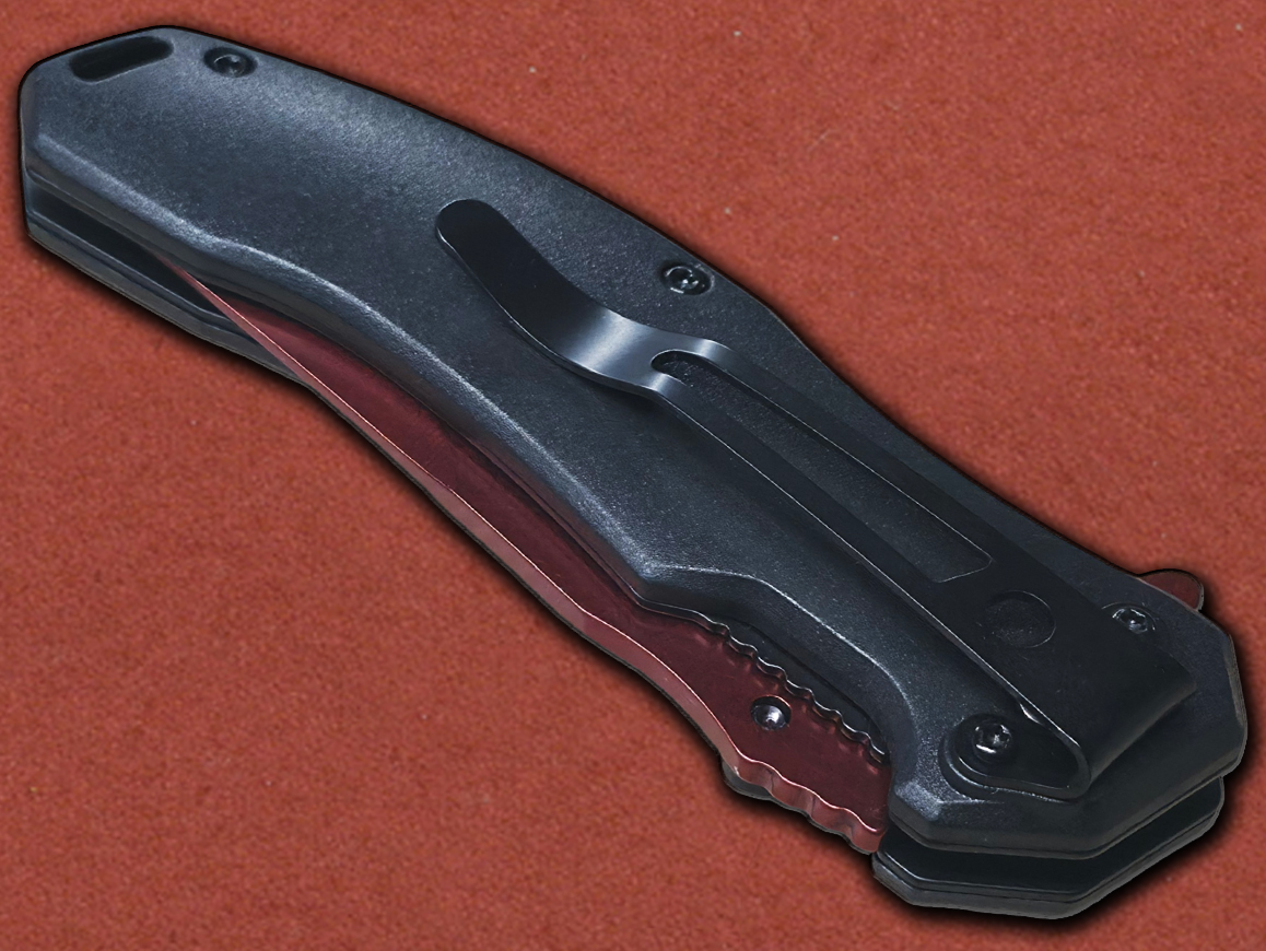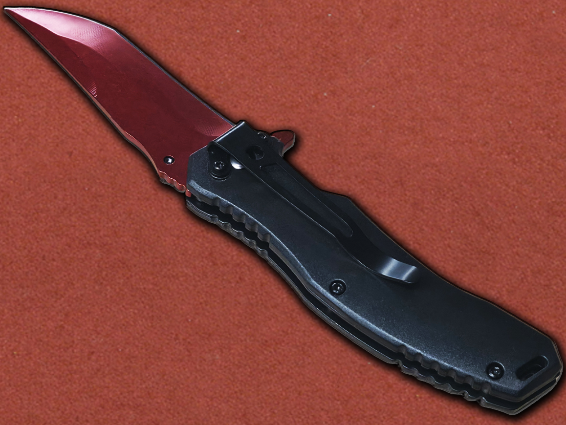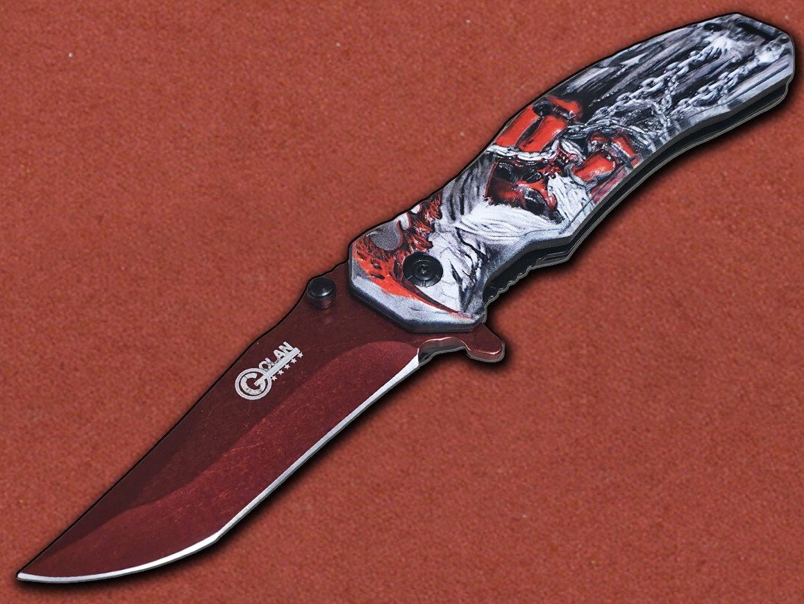 The Golan Scarlett Skull is a bold, eye-catching folding knife that stands out with its vivid scarlet-red sculptured polymer handle featuring an intricate Ferryman (Charon) skull-themed design – a dramatic, fantasy-inspired motif that gives it real character and a gothic edge.