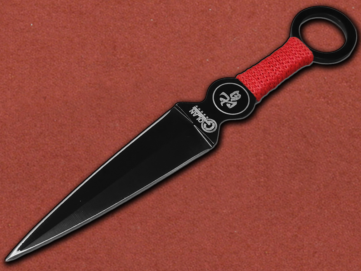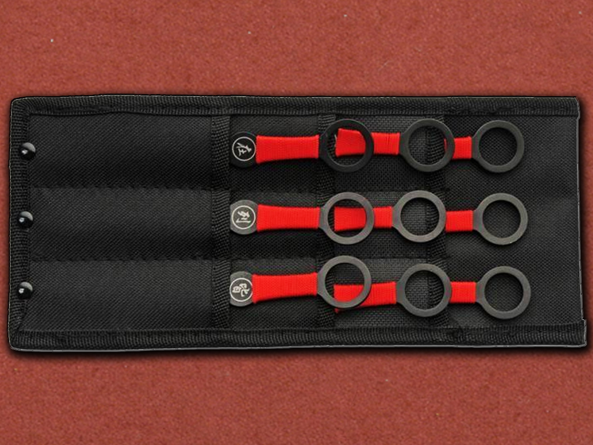 The Golan Kunai Throwing Knife Set with nine knives features black blades and red cord-wrapped handles with each knife measuring 6.25 inches overall. The set includes nine black stainless steel throwers. All knives feature red cord-wrapped handles with Chinese inscriptions. It comes complete with a black nylon sheath for easy and safe transport.