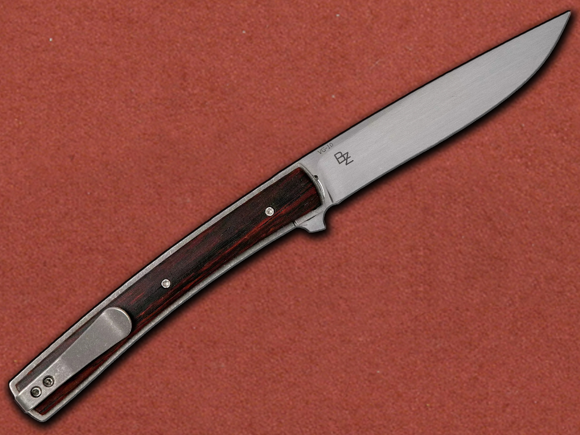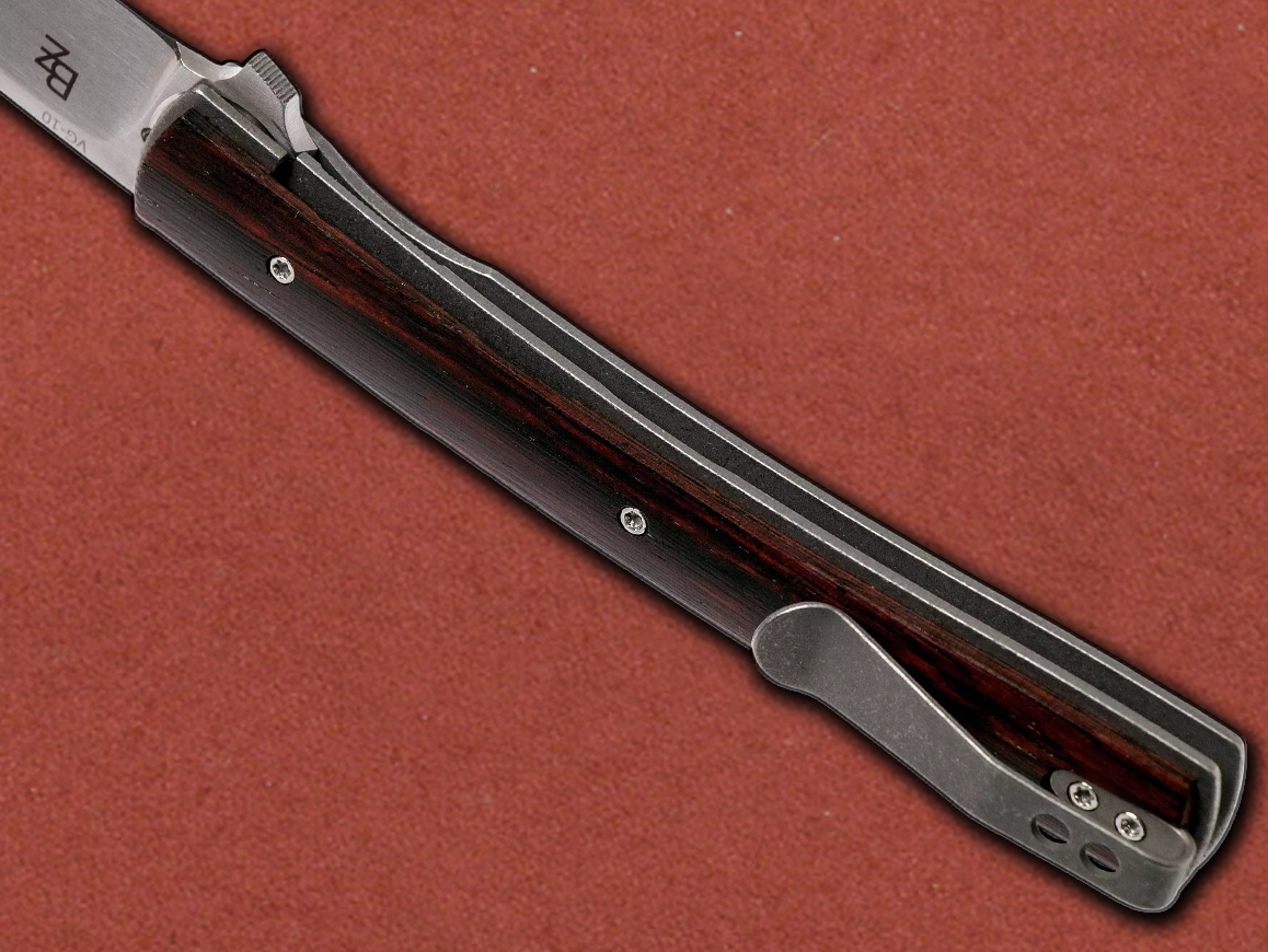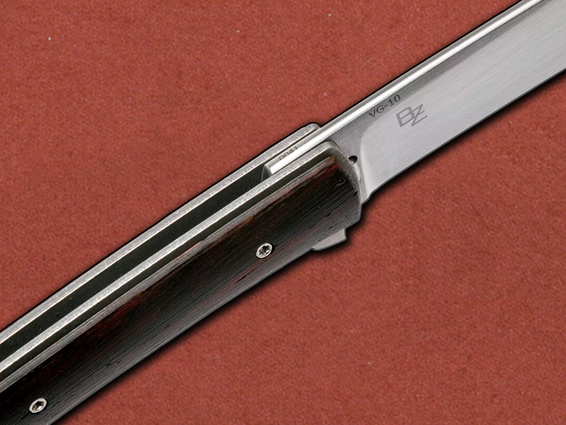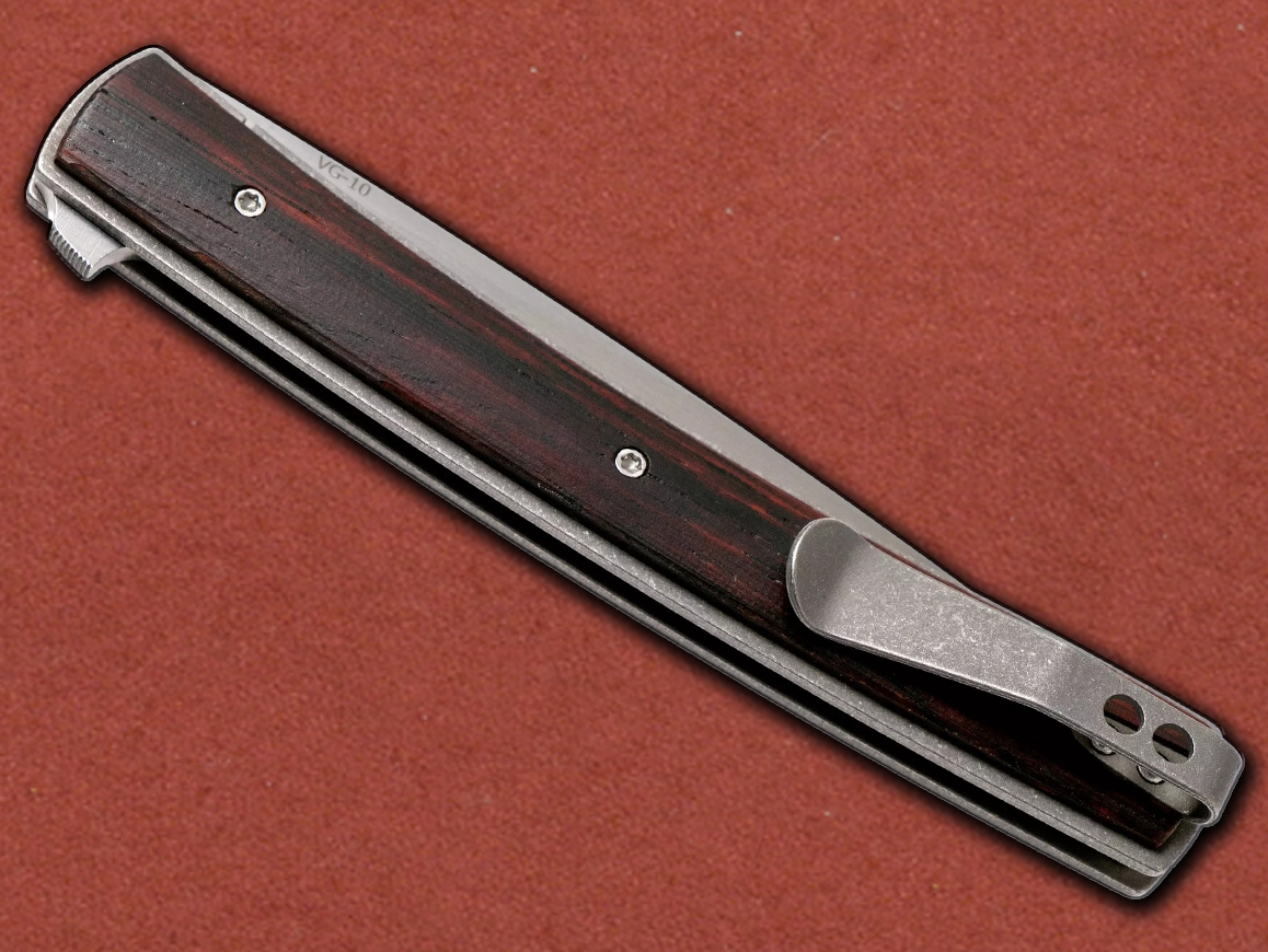 The VG-10 stainless steel blade, mounted on ball bearings, opens smoothly via flipper and locks securely with a reliable frame design. Titanium liners paired with warm Cocobolo wood scales give the knife its distinctive gentleman’s appeal - slim, lightweight, and irresistibly elegant.